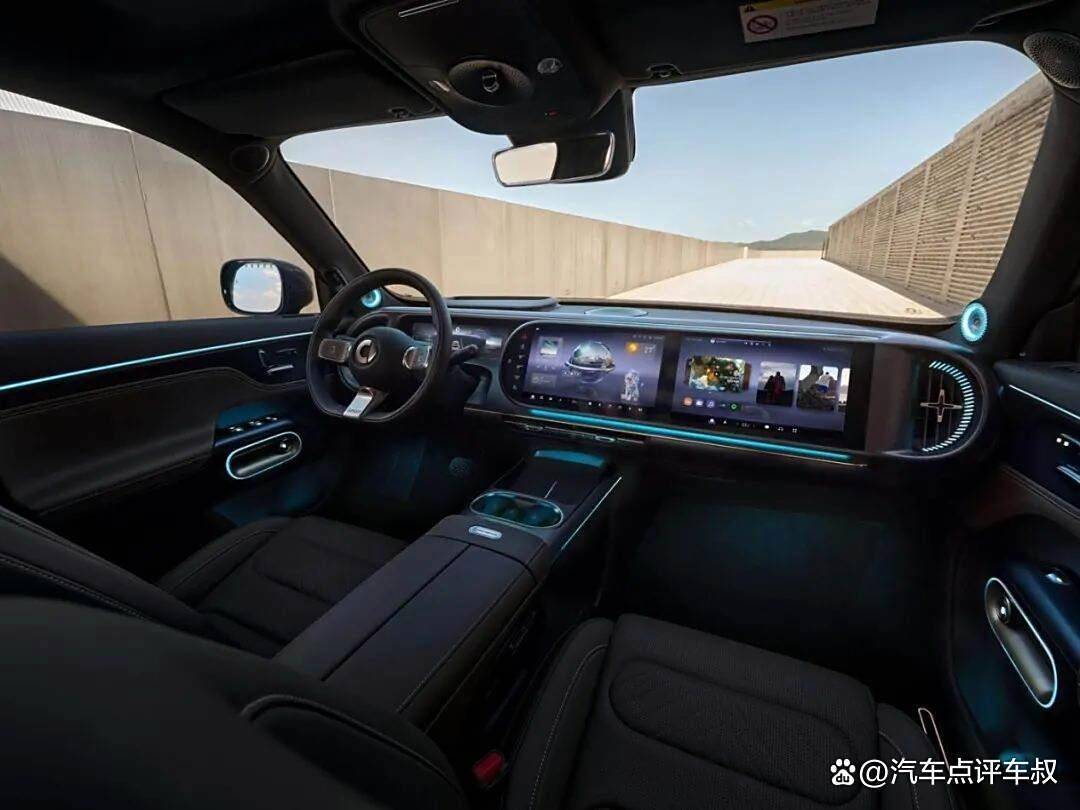 内饰方面,中控屏与副驾屏采用一体式的6K贯穿屏,尺寸达30英寸,支持AI大模型语音助手,全车六个座位都能语音控制。液晶仪表盘独立设计,尺寸相对较小,不影响驾驶。此外新车还配备了AR - HUD。中控台采用大面积的软包材质,还配备256色的氛围灯以及三种香氛,全车配备23个扬声器。